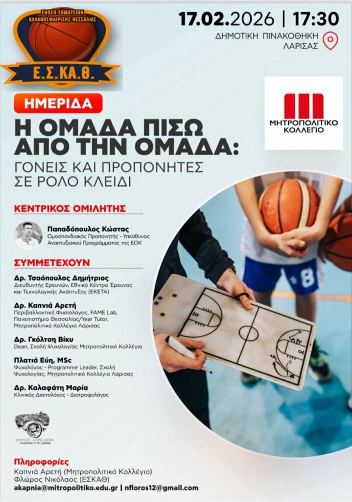 Η ημερίδα θα πραγματοποιηθεί την Τρίτη 17 Φεβρουαρίου 2026 και ώρα 17:30, στη Δημοτική Πινακοθήκη Λάρισας, και απευθύνεται σε γονείς και προπονητές αθλητών καλαθοσφαίρισης, με στόχο την ουσιαστική ενημέρωση και ενίσχυση του ρόλου τους στη διαμόρφωση ενός υγιούς και υποστηρικτικού αθλητικού περιβάλλοντος.